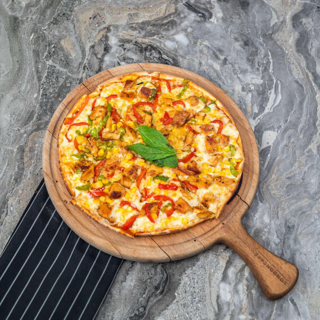 Tavuklu Pizza İçindekiler:Domates Sosu Mozeralla, Renkli Biberler, Tavuk Parçaları Patates Kızartması Ile Fiyat:400 TL