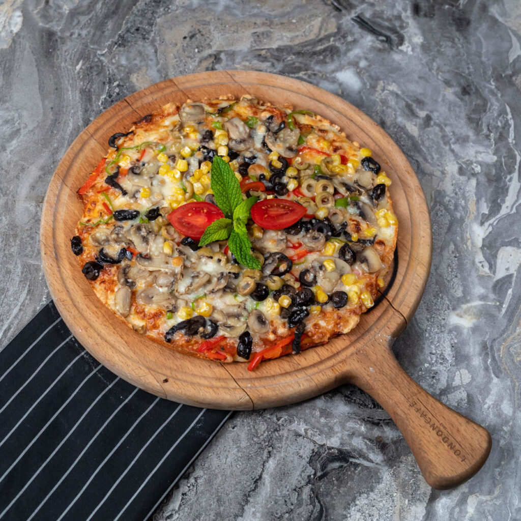 Vejeteryan Pizza İçindekiler:Domates Sosu Mozeralla, Renkli Biberler, Mısır, Zeytin, Patates Kızartması Ile Fiyat:350 TL